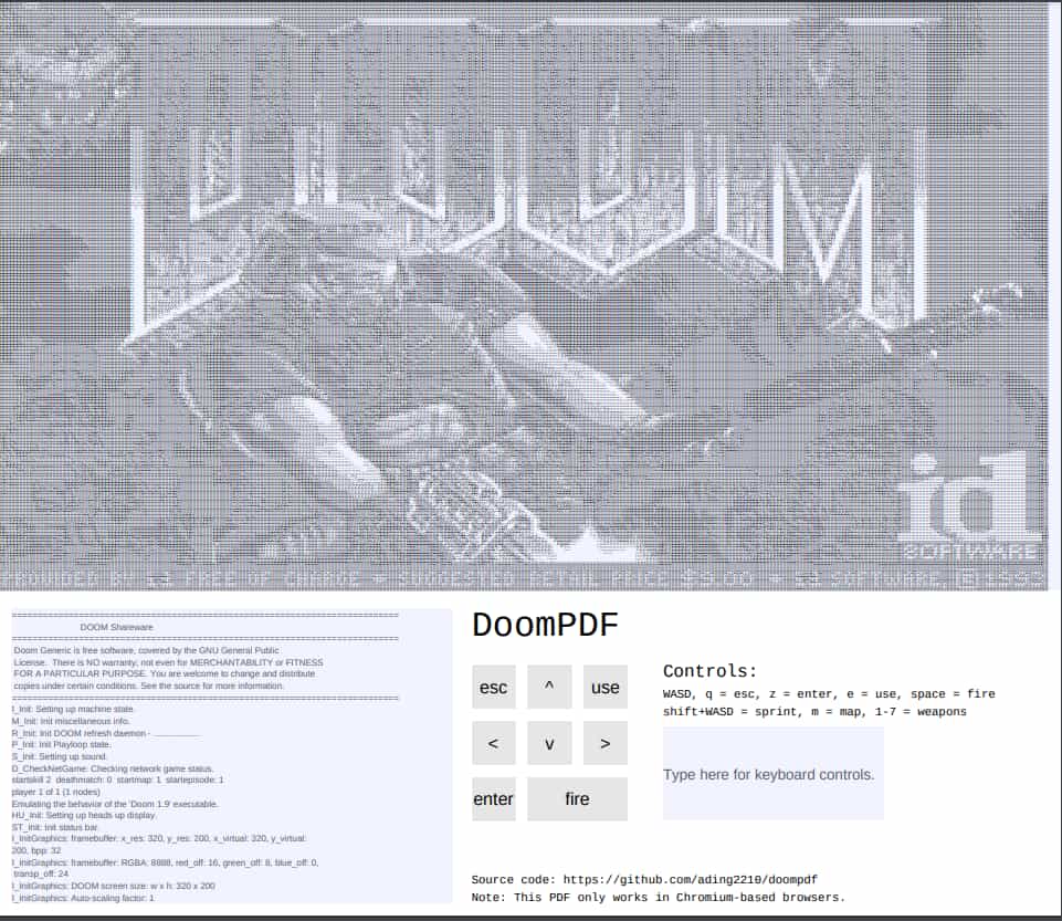 Выглядит это довольно забавно – вся графика здесь рисуется с помощью символов ASCII. Реальной такой порт сделала поддержка JavaScript в движках PDF современных браузеров. Кстати, недавно был представлен похожий порт – в PDF полностью перенесли классический Тетрис.