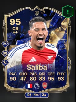 Мало кто захочет выбрасывать 6кк на защитника, но если и тратить такую сумму, то именно на Салиба. Он ничем не хуже TOTY Ван Дейка – у Салиба топовый пейс, защита и сила, а вдобавок ему дали золотого енота. Им можно даже фармить голевые: под общим рейтингом паса в 80 скрываются 92 короткий пас и 86 длинный. Берем не думая.