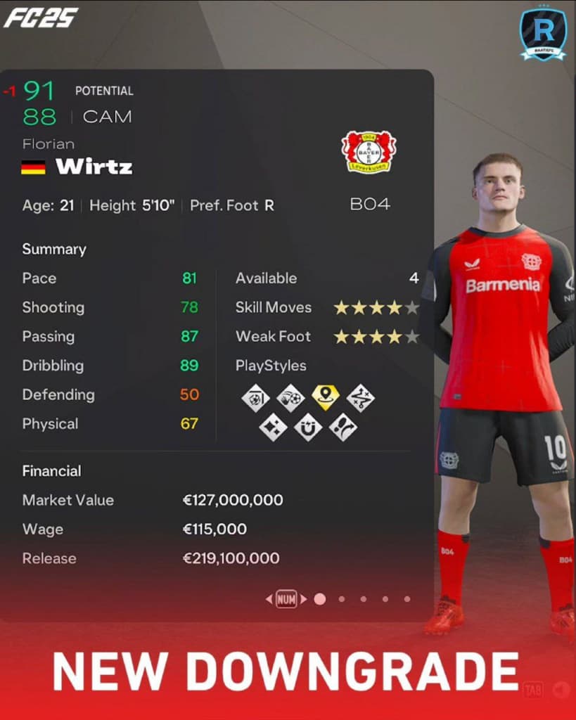 Другому немецкому вундеркинду тоже досталось – у Вирца теперь потенциал 91. Хотя опять же, это мало что меняет в режиме карьеры.
