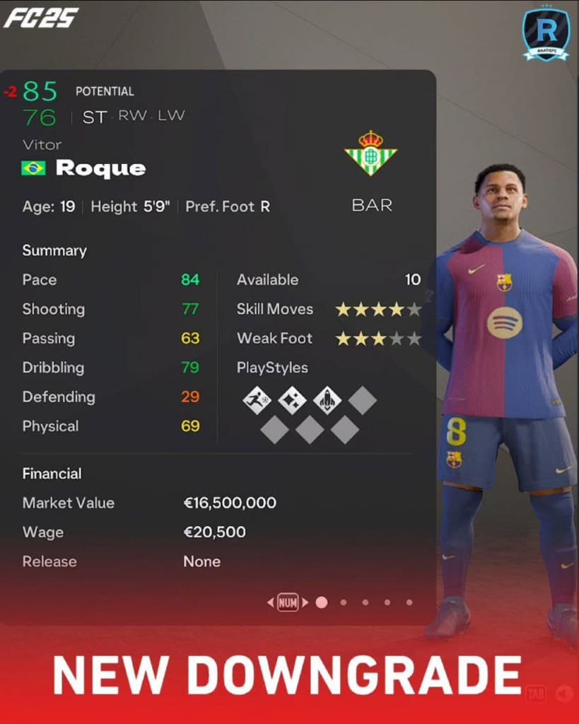 Витор Роке не прижился в «Барселоне», да и в аренде в «Бетисе» пока тоже не все так радужно. Итог – заслуженное понижение потенциала на два пункта, до 85. Ждем и понижения рейтинга?