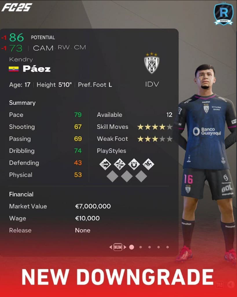 У эквадорского таланта в последнее время не клеится – говорят, он пока подзабил на футбол и увлекся другими не очень полезными для спортсмена развлечениями. Закономерное понижение и рейтинга, и потенциала. Кстати, для любителей вундеркиндов – в игре он в «Челси» не переходит.