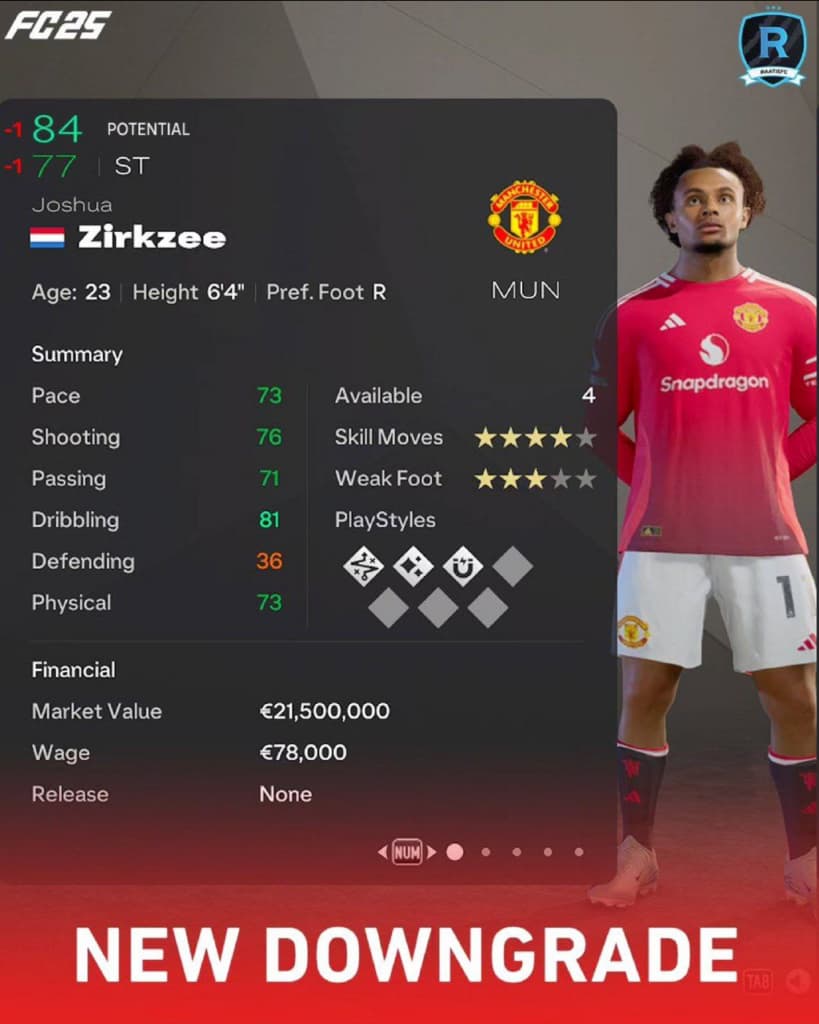 «МЮ» пока все никак не взлетит, карьера Зиркзе тоже пока остановилась. Разработчики отметили это понижением рейтинга и потенциала, пока что всего на единичку.