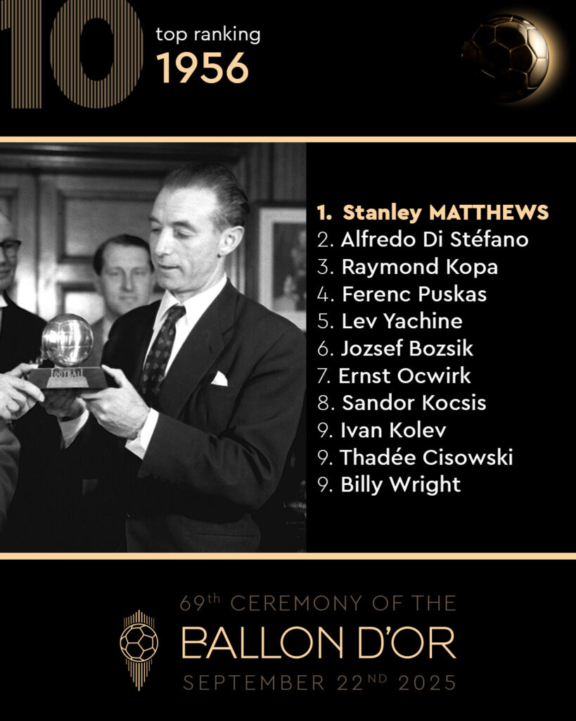 Здесь есть пара не очень знакомых имен. Стэнли Мэттьюз — обладатель первого «Золотого мяча». Тогда он выступал за «Блэкпул» и получил награду в 41 год: приз ему дали не за выдающийся сезон, а за всю карьеру.