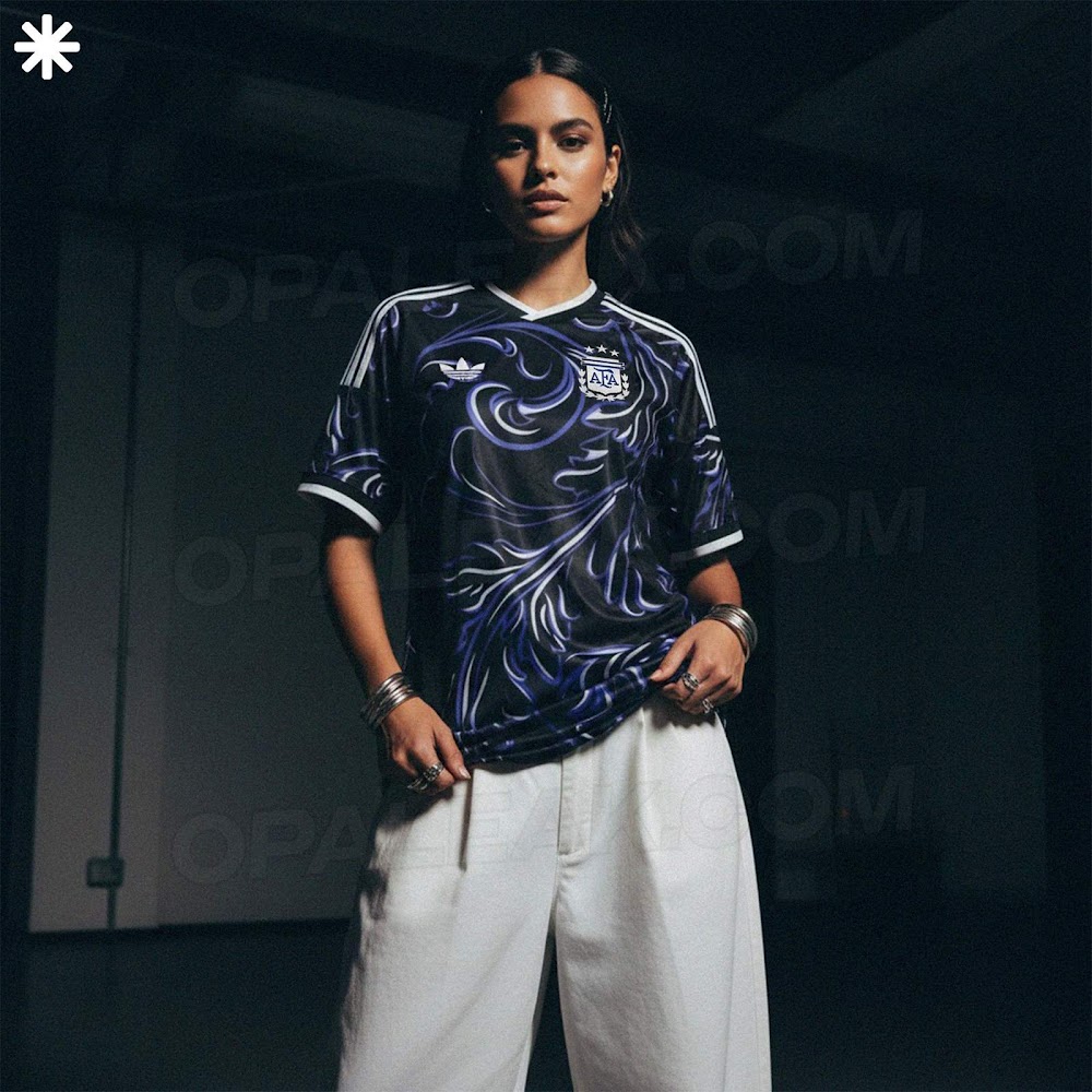Новая аргентинская джерси будет черного цвета — впервые чемпионата мира 2018 года в России. На форму нанесли узор бело-синего цвета. Вместо стандартного логотипа adidas здесь изображен трилистник — такой будет на всех гостевых формах, произведенных adidas к ЧМ-26.