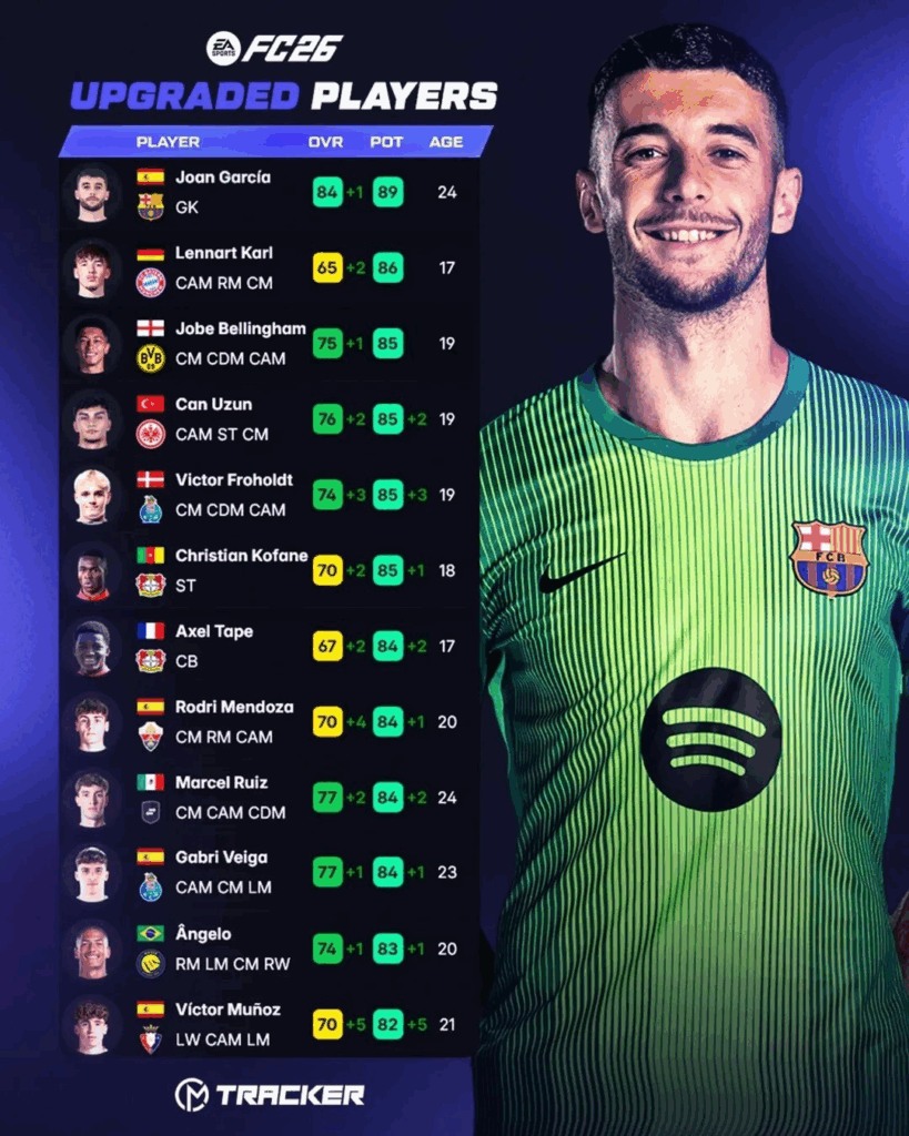 Обновился голкипер «Барселоны» Жоан Гарсия — теперь его рейтинг достиг 84. Из других плюсов: удивил вингер «Осасуны» Виктор Муньос, которому подняли и рейтинг, и потенциал аж на пять пунктов. Также отметим Виктора Фрохольдта и Джана Узуна: 19-летние игроки станут еще более полезными в режиме карьеры.
