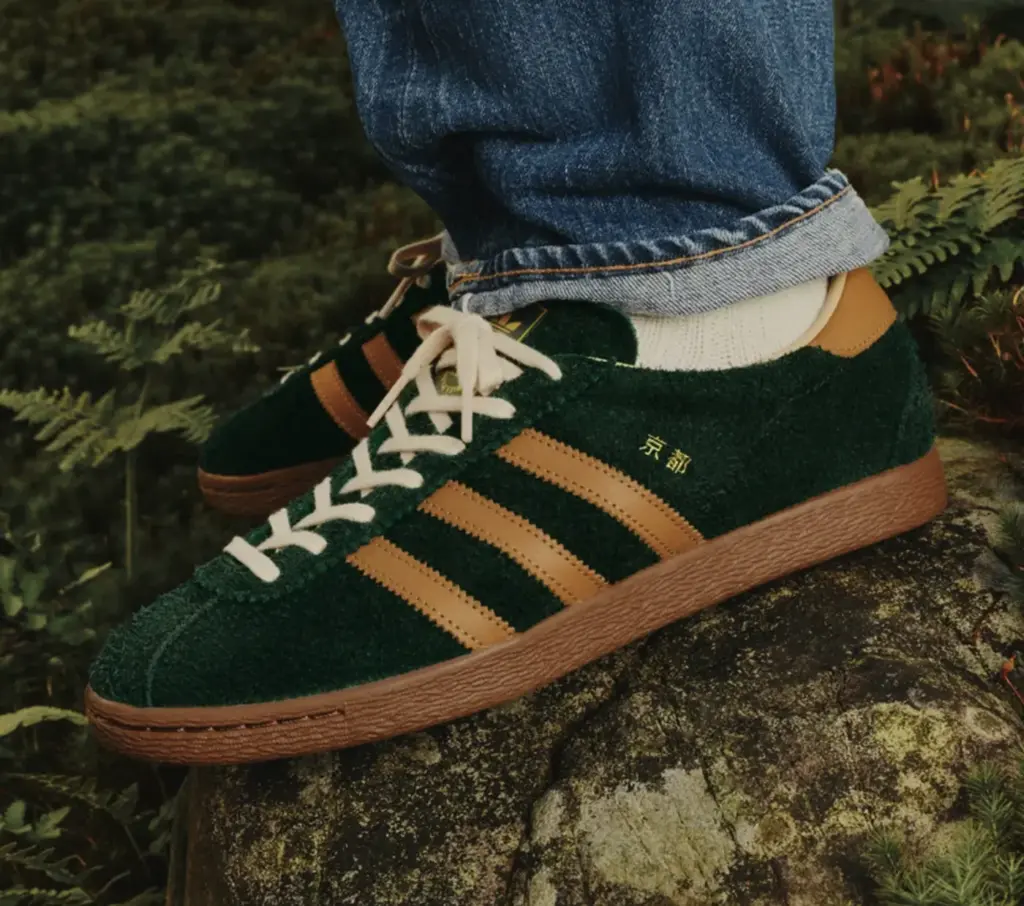 Это не совсем оригинальные релизы: за дизайн взялись два отдельных ритейлера. Японский Billy’s раскрасил классические adidas Tabacco в глубокий зеленый цвет с желтыми акцентами. Сбоку вышивка на японском — переводится буквально как Киото.