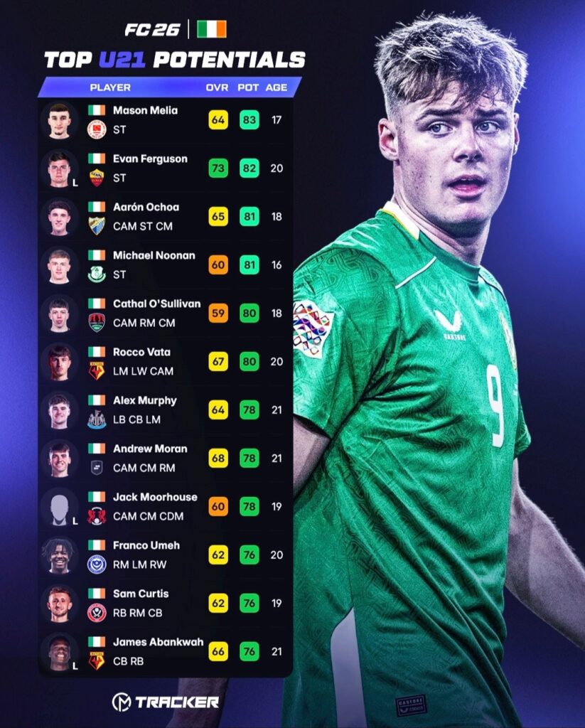 Самым высоким потенциалом среди молодых ирландцев обладает 17-летний Мейсон Мелия из «Сент-Патрикс Атлетик» – ему разработчики пророчат рейтинг в 83 единицы при текущих 64.