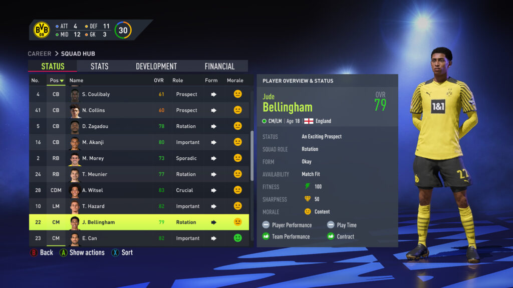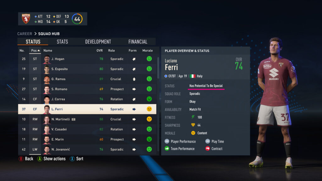 Искать эти подсказки нужно было во вкладке с составом. У каждого игрока есть строчка «статус» — у тех, кому 22 года и более, обычно было написано «в клубе с … года». А вот у молодых игроков зачастую можно было встретить другие надписи, которые намекали на потенциал.