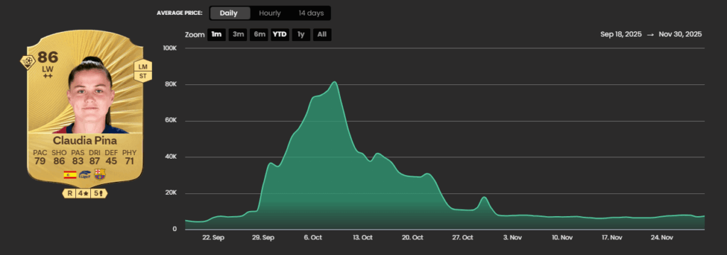 Например, после первых обновлений главной футболисткой в игре стала Клаудиа Пина. Прайс на карточку игрока женской «Барселоны» подскочил до 70-80 тысяч монет. Следующие патчи изменили структуру игры, подкачав защиту ИИ. В результате карта упала с 70 тысяч до 6-7 тысяч.