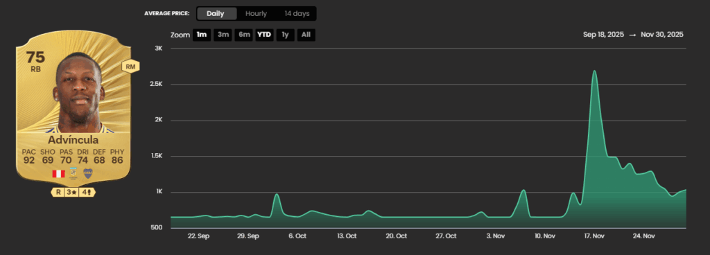 Собирая состав под паки, игрокам иногда недостает футболистов из определенных лиг и определенных стран. Из ноябрьских примеров – Перу в СБЧ на регион Латинской Америки. Бронзовые футболисты, которые еще в октябре казались абсолютно ненужными, в следующем месяце взлетели до 1000-1500 монет из-за их редкости на рынке.