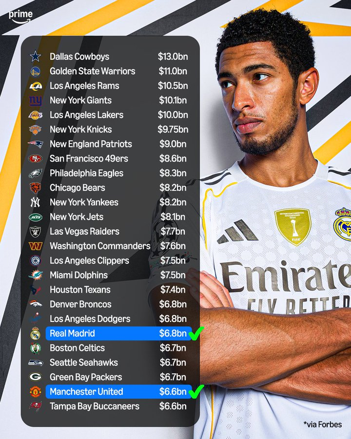 Единственными представителями от футбола оказались «Реал», оценивающийся в 6,8 миллиардов долларов, а также «Манчестер Юнайтед» с ценником в 6,6 миллиардов.