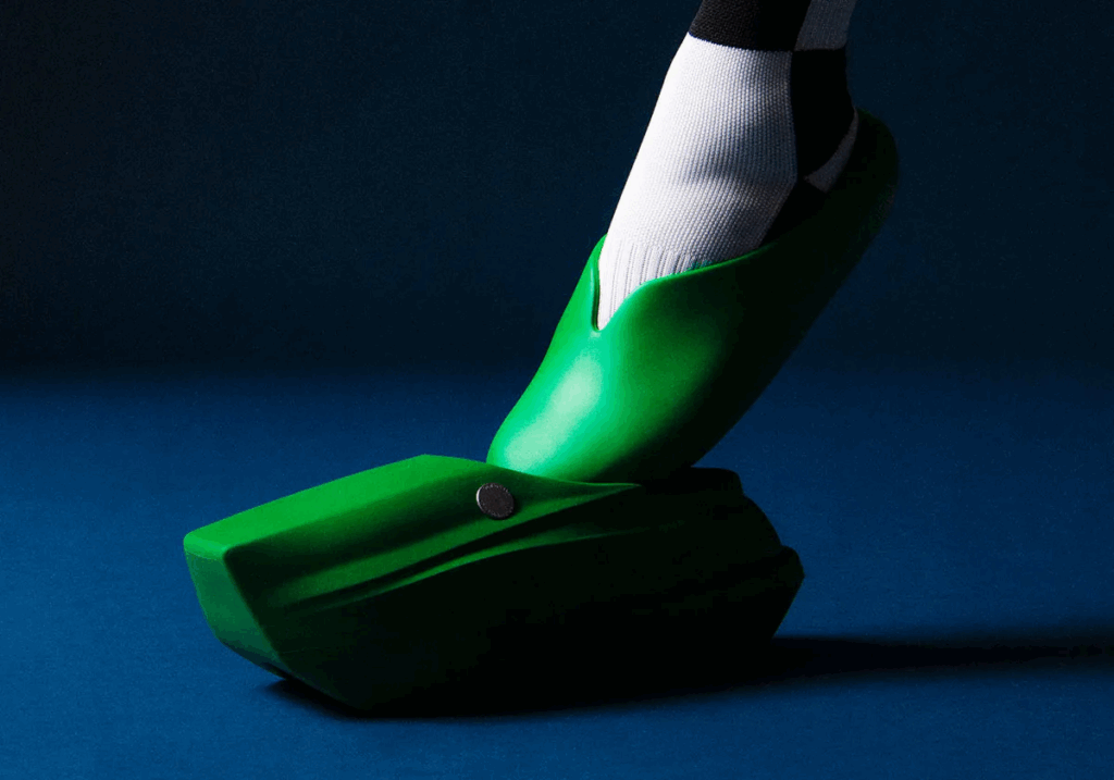 Резиновые тапочки вставляются в квадратную «оболочку», имеющую рубленые формы. Получается модульная конструкция — словно в «собранном» виде обувь предназначается для улицы, а внутренняя обувь — для дома.
