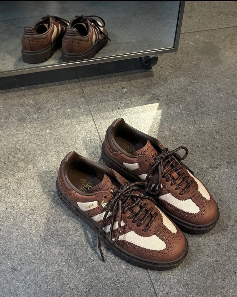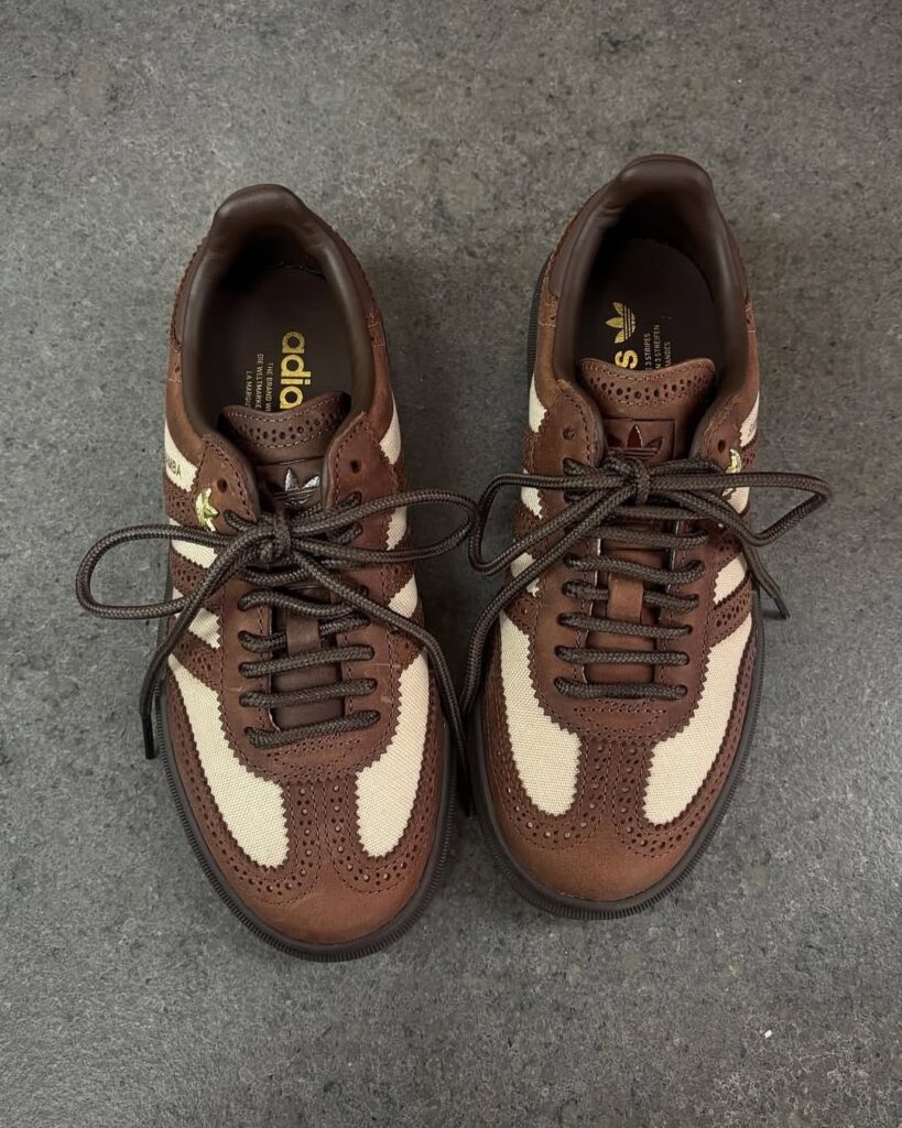 adidas Samba WTR «Brown» сделаны из темно-коричневой кожи и дополнены бежевыми текстильными вставками в области носка и на боковых панелях. Это придает контрастность и текстуру, не перегружая дизайн.