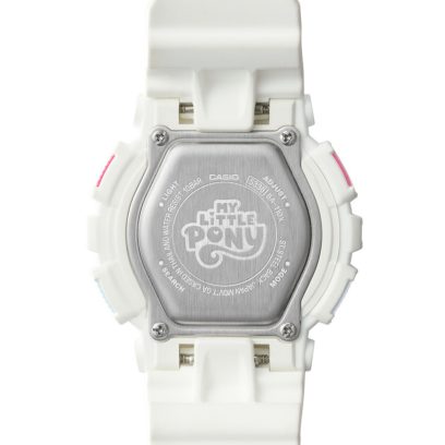 G-Shock выполнены в белом корпусе. Из элементов дизайна — изображения Искорки и Радуги Дэш, розовые акценты и разноцветные принты на ремешке.