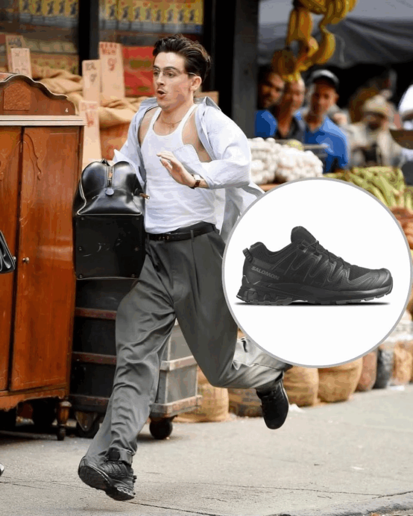 Многие фанаты актера заметили, что в «Марти Великолепном» Шаламе носит вполне себе современную обувь. На одном из кадров можно заметить, что на нем Salomon XA-PRO 3D V9, которые вышли в 2024 году.