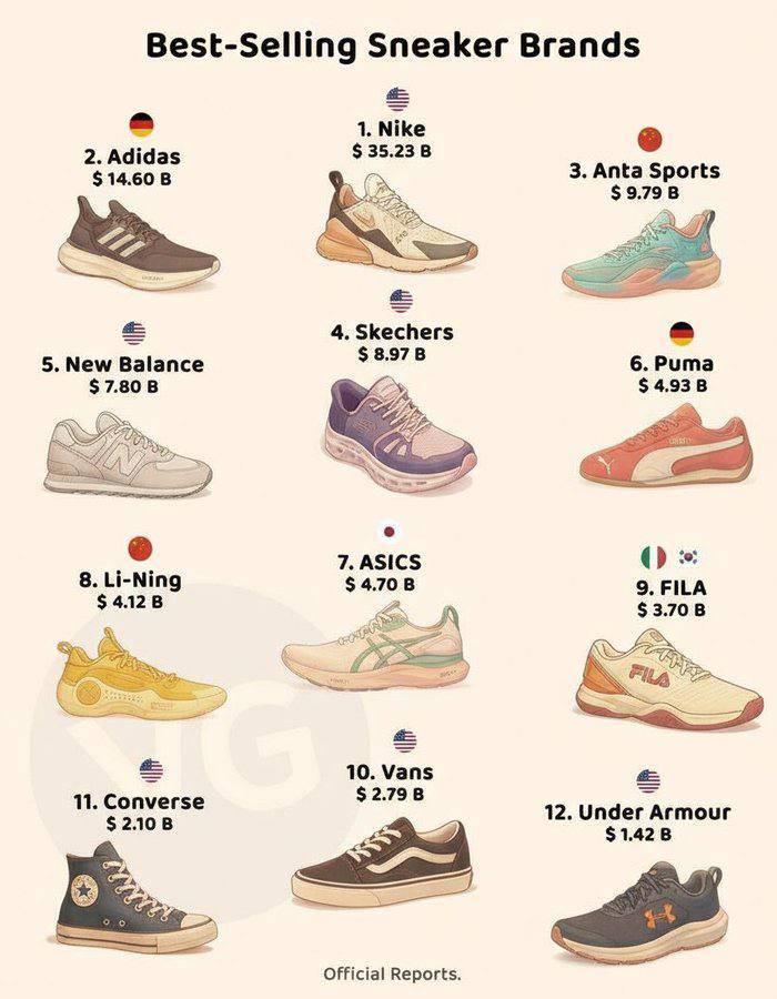 Кто самый богатый производитель кроссовок сегодня? Издание VG собрало и опубликовала топ из 12 богатейших брендов. Вне пятерки оказались сразу несколько популярных компаний. А в тройке — неожиданный бренд.