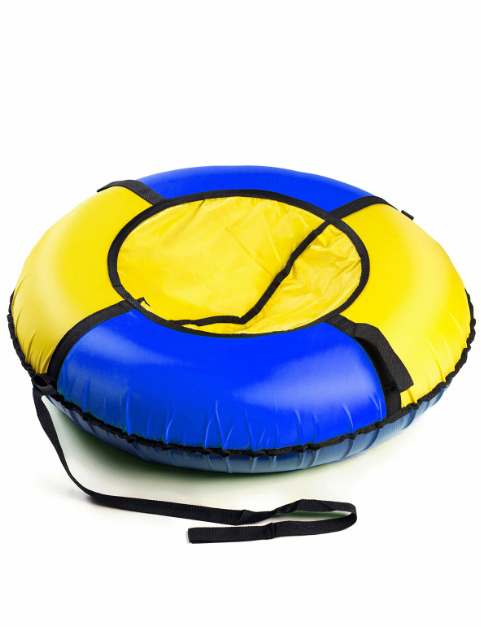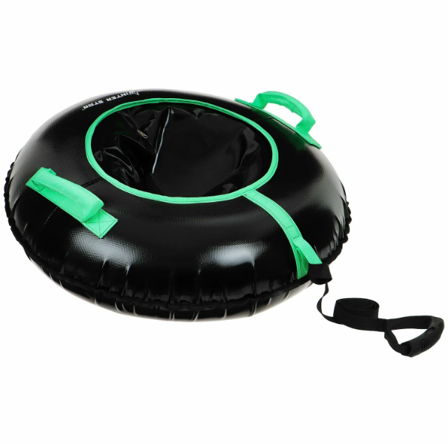 Тюбинг выполнен из надежных тканей двух разных видов: Oxford (ткань верха) и скользящий ПВХ (ткань дна). Ручки вшиты в общую конструкцию, а еще у модели укрепленное посадочное место. В комплекте модели есть буксировочный трос и камера. На маркетплейсе можно выбрать разные диаметры – от 90 см до 110 см.
