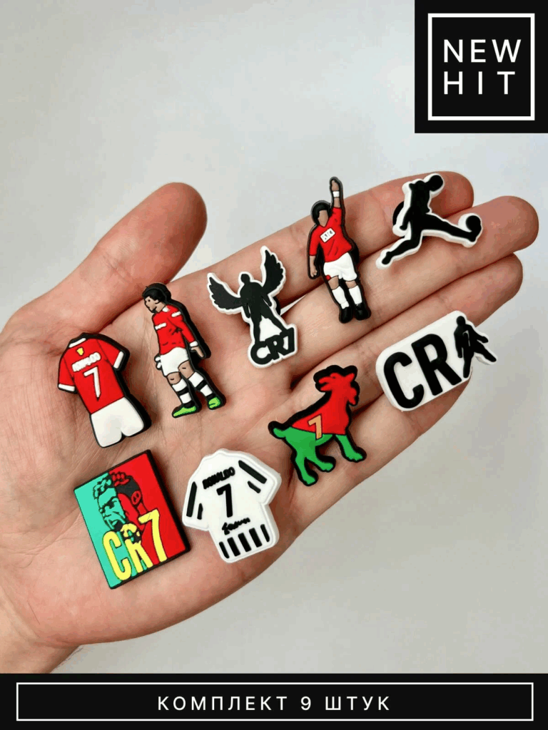 Далее — набор для фанатов Роналду. Большинство значков посвящены его карьере в «МЮ», один отсылает к «Ювентусу», остальные — к сборной Португалии. В любом случае, персональным болельщикам Криша зайдет. Цена — 281 рубль за набор из девяти джибитсов.