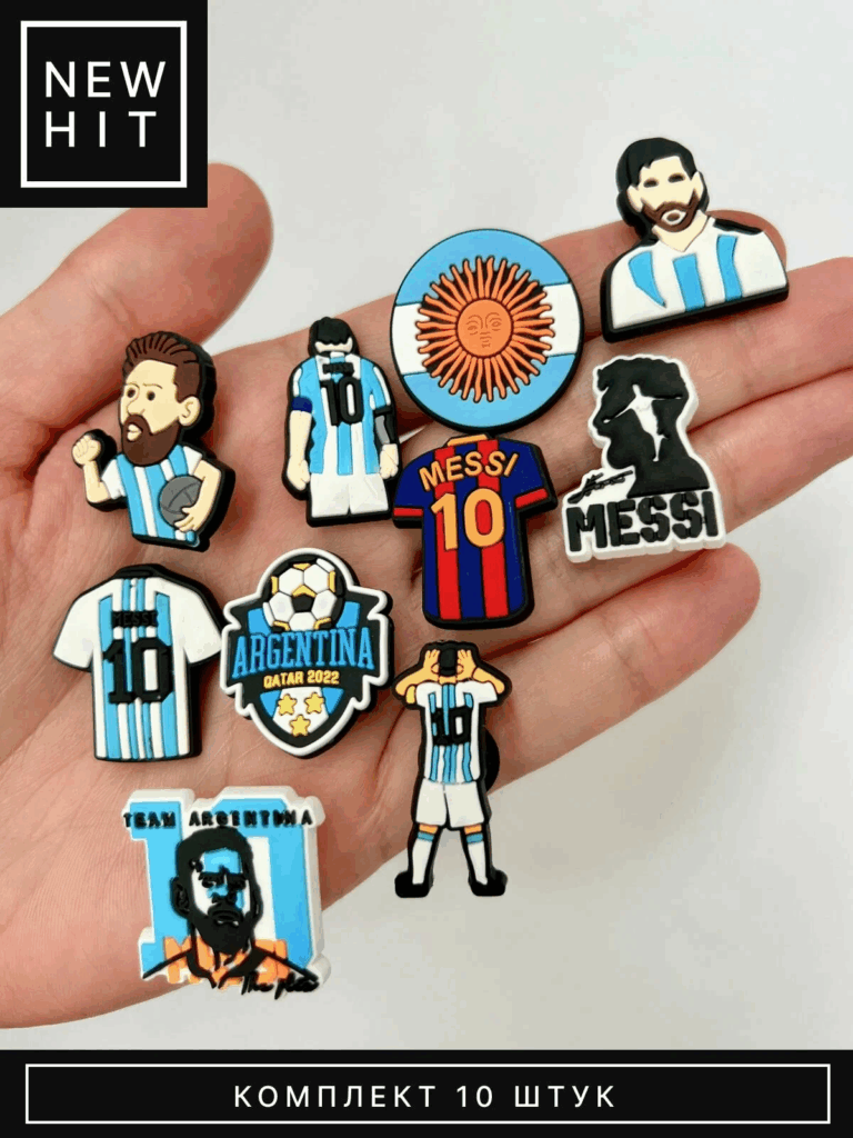 А это уже набор джибитсов для фанатов Лионеля Месси. Тут собрали значки самых разных стилей, но почти все они посвящены Лео в сборной Аргентины. В этом наборе на один значок больше, а стоит он дешевле — 254 рубля.