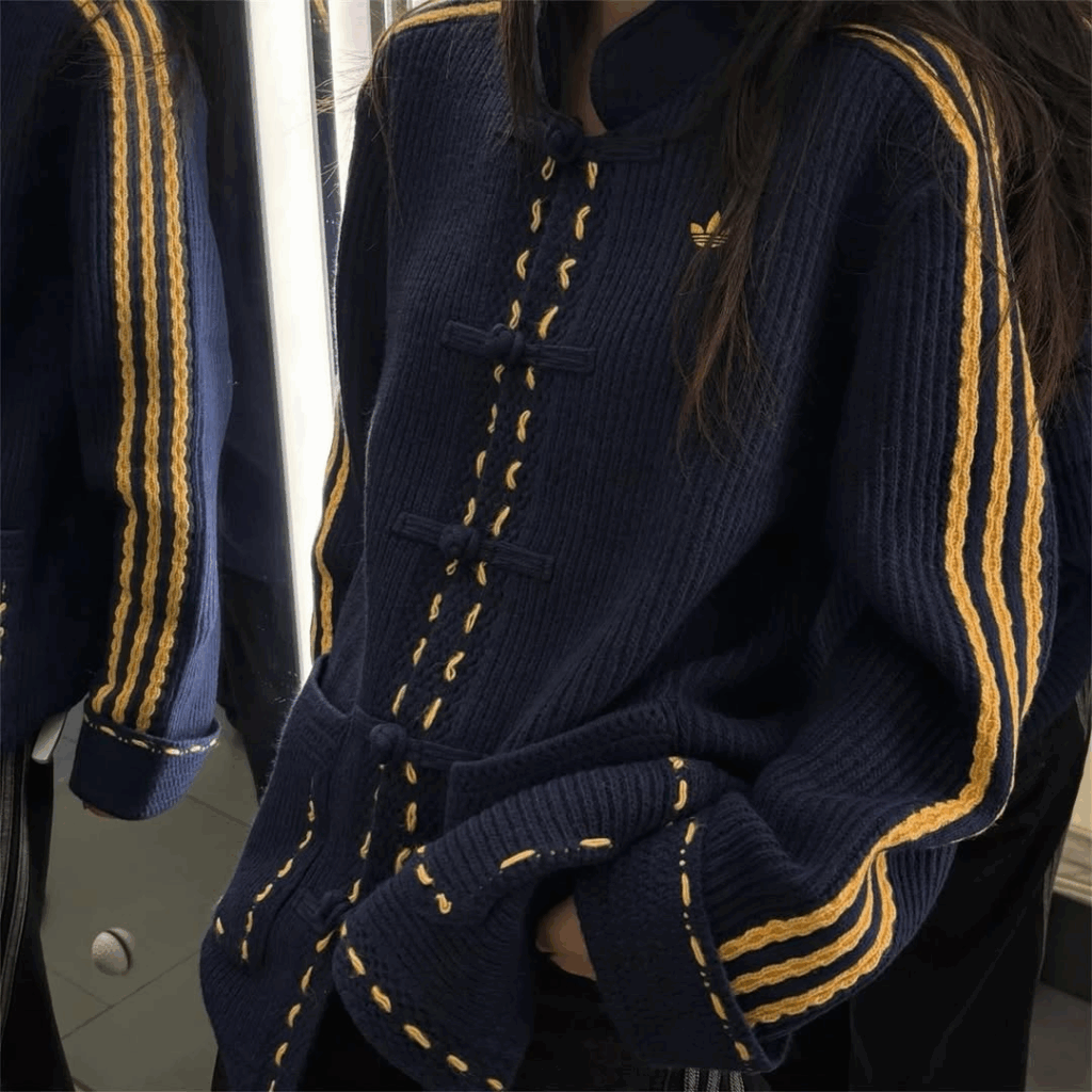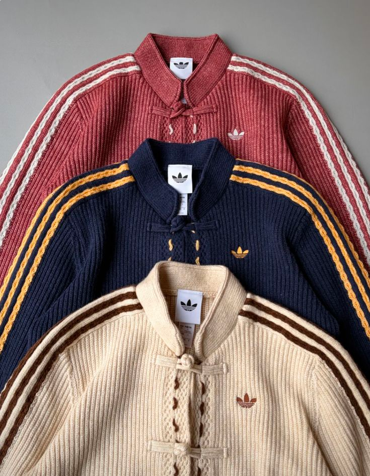В той же коллекции adidas Originals был целый пак из вязаных свитеров (ну, или кофт) в китайском стиле. Это такой унисекс-кардиган с застежками, созданный из премиальной шерсти. Идеальный вариант на остаток зимы.