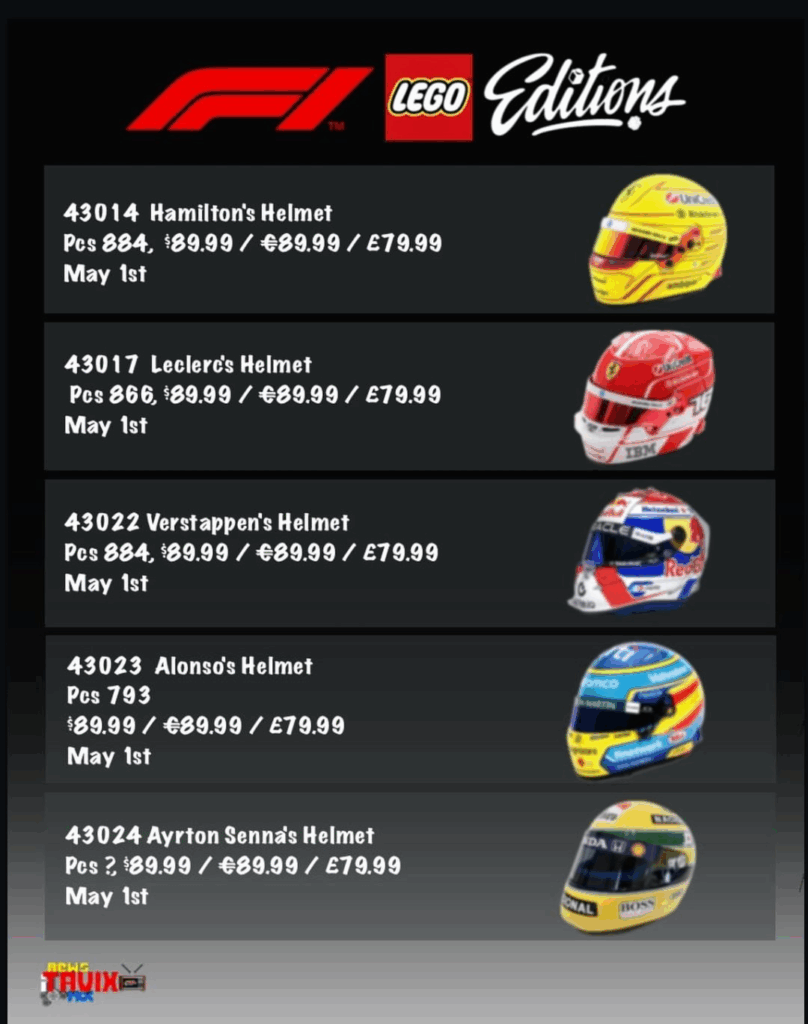 LEGO готовят релиз из пяти наборов, посвященных гонщикам «Формулы». Это будут сеты со шлемами культовых спортсменов. Шлем из LEGO получат Льюис Хэмилтон, Шарль Леклер, Макс Ферстаппен, Фернандо Алонсо и Айртон Сенна.