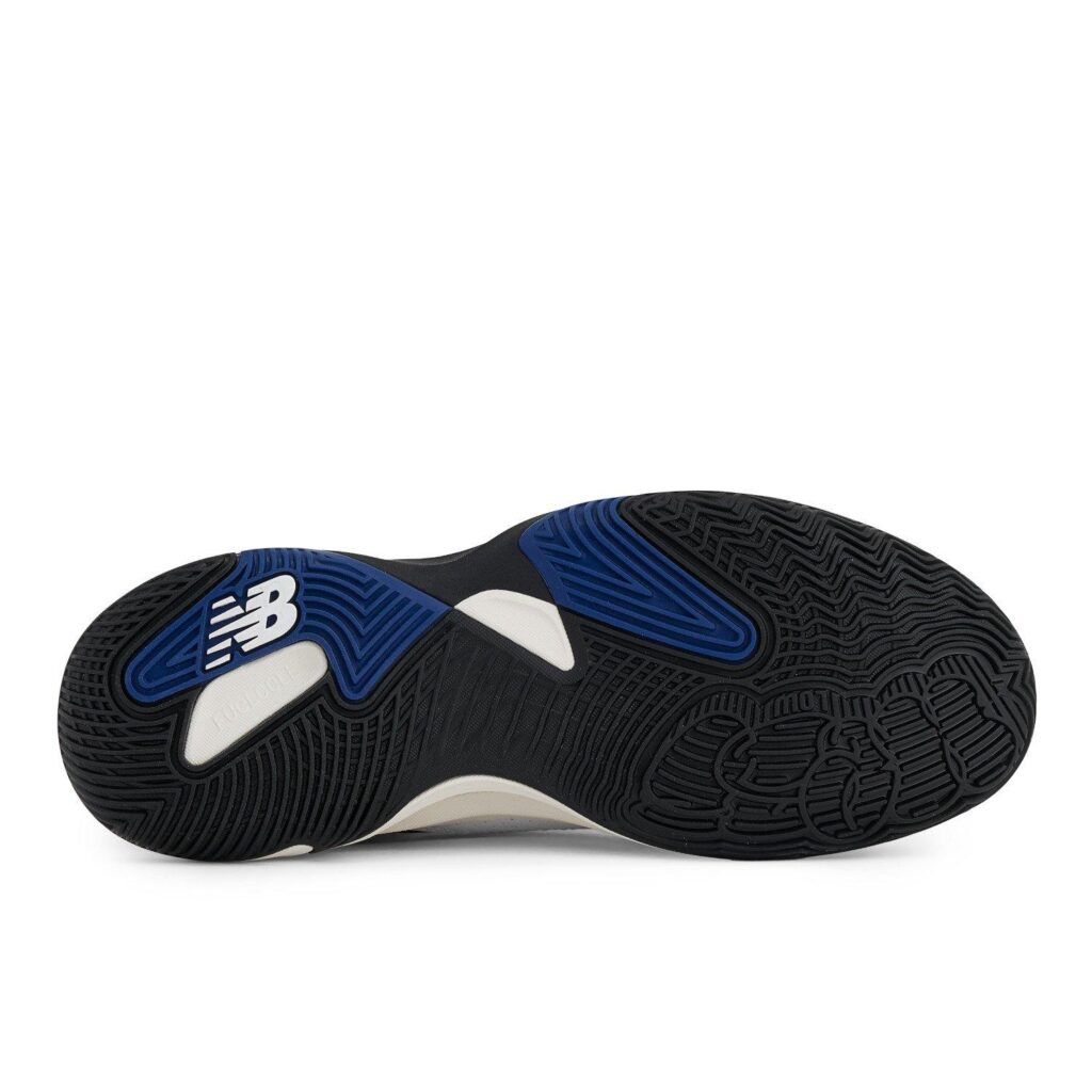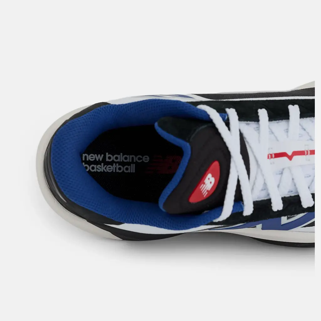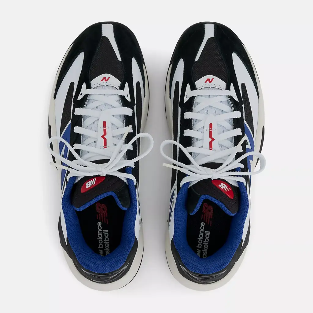 Черная замша покрывает носок и переднюю часть, обеспечивая прочность в местах повышенного износа, а открытые белые боковые вставки делают модель более легкой. Синие акценты на стельке и фирменный логотип в виде буквы «N» создают изысканный контраст с черно-белым верхом.