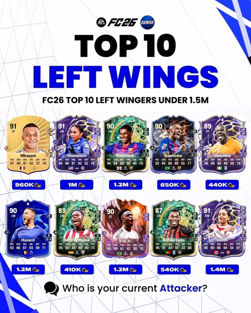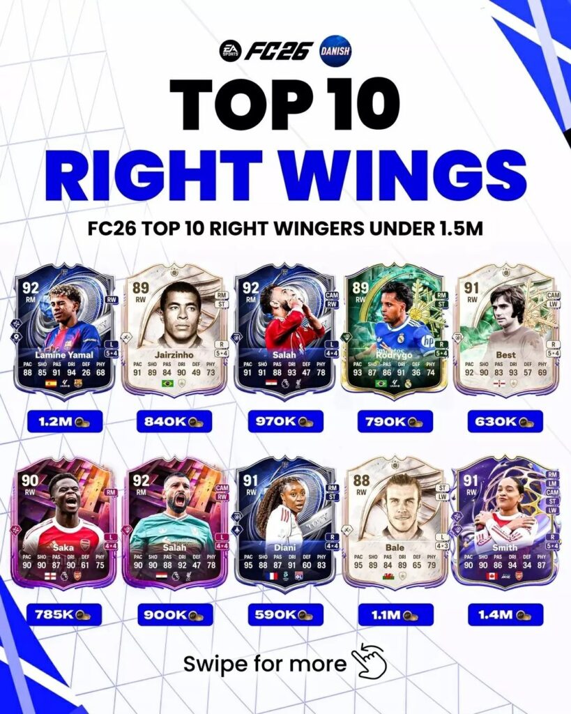 Фланги в EA FC 26 по-прежнему решают исход матчей: скорость, дриблинг и точный последний пас могут вскрыть даже самую плотную оборону. Мы собрали топ-10 левых и правых вингеров, чьи карточки стоят до 1 500 000 монет и при этом дают максимум эффективности на поле. В подборке – 20 игроков с высокими рейтингами и впечатляющими статами, которые усилят практически любую схему.