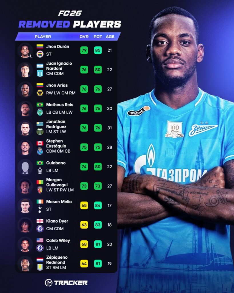 Из EA FC 26 удалили новичка петербуржского «Зенита» Джона Дурана. Российской Премьер-лиги нет в игре, поэтому колумбийца убрали на время аренды в клуб РПЛ. На картинке ниже указаны и другие футболисты, за которых теперь нельзя поиграть: