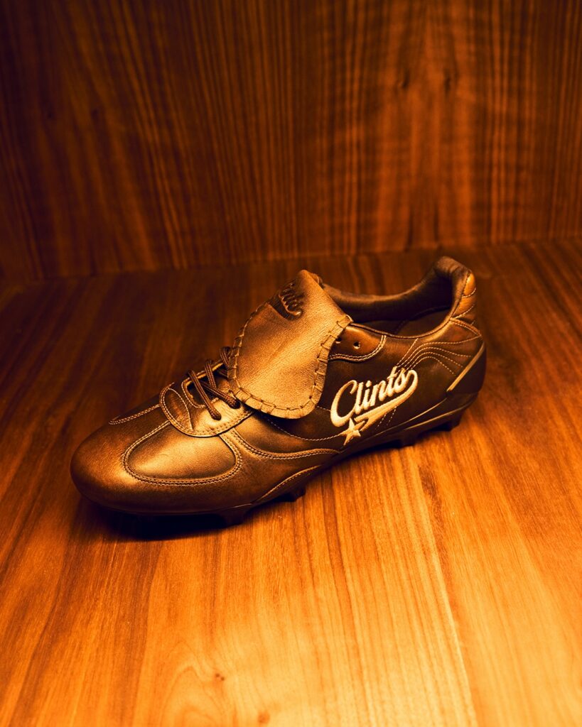 Летом Clints планируют дропнуть настоящие футбольные бутсы. Кадры уже появились в сети — это темно-коричневая, будто состаренная обувь с загнутым вперед язычком.