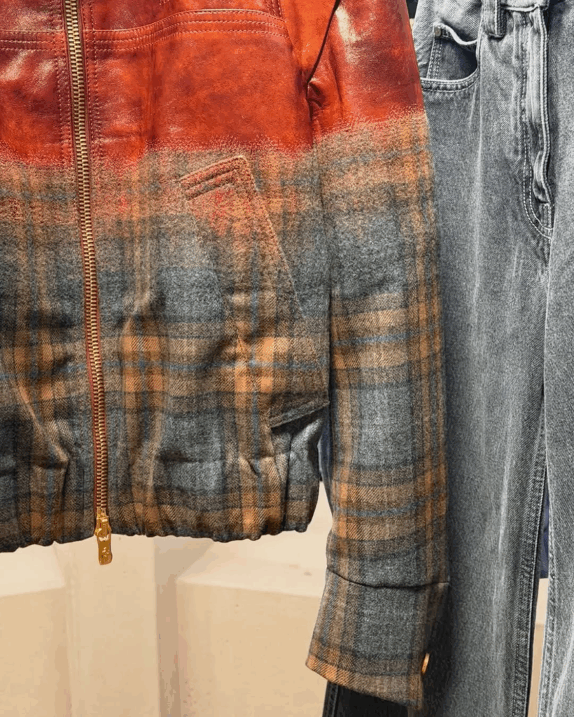 Фишка куртки — плавный переход от кожи, из которой сшит верх, в шерсть, из которой выполнен низ. Получился буквально градиент из двух цветов и материалов.