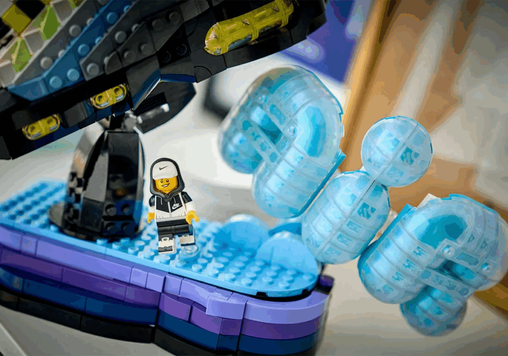 В наборе будет один кроссовок на подставке, большая надпись Air, а также минифигурка человечка, полностью одетого в Nike.