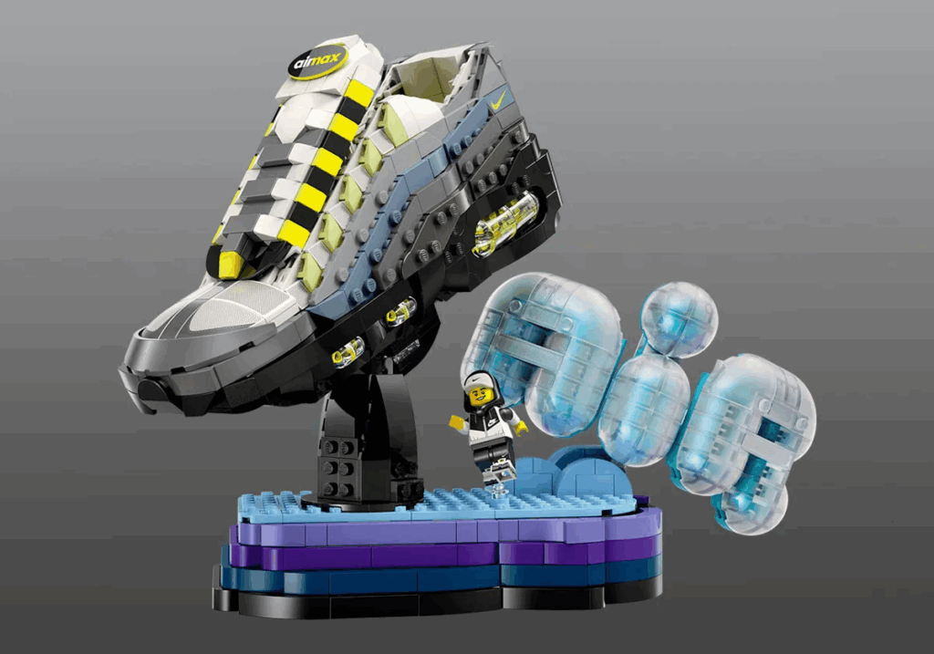 В этот раз бренды снова объединились для создания нового силуэта из конструктора. Из кубиков собрали Nike Air Max 95 Neon. Это культовая модель, которая впервые вышла в 1995 году.
