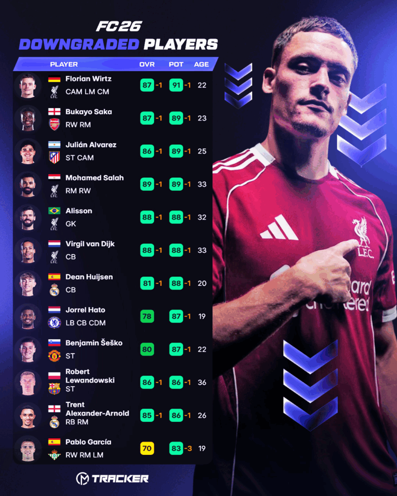 Тут сюрпризов быть не должно: страдают звезды «Ливерпуля», который сейчас вообще не в форме. Минус один получили Салах, Виртц, Алиссон и Ван Дейк. Убавили единицу рейтинга и у Букайо Сака.