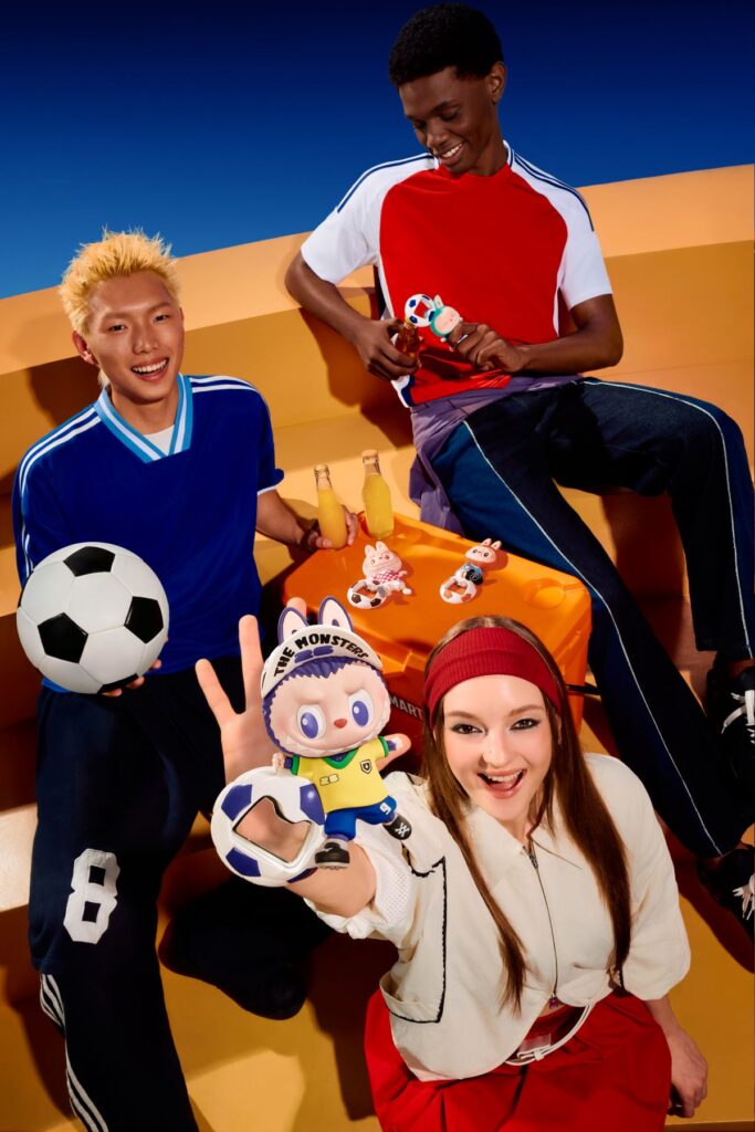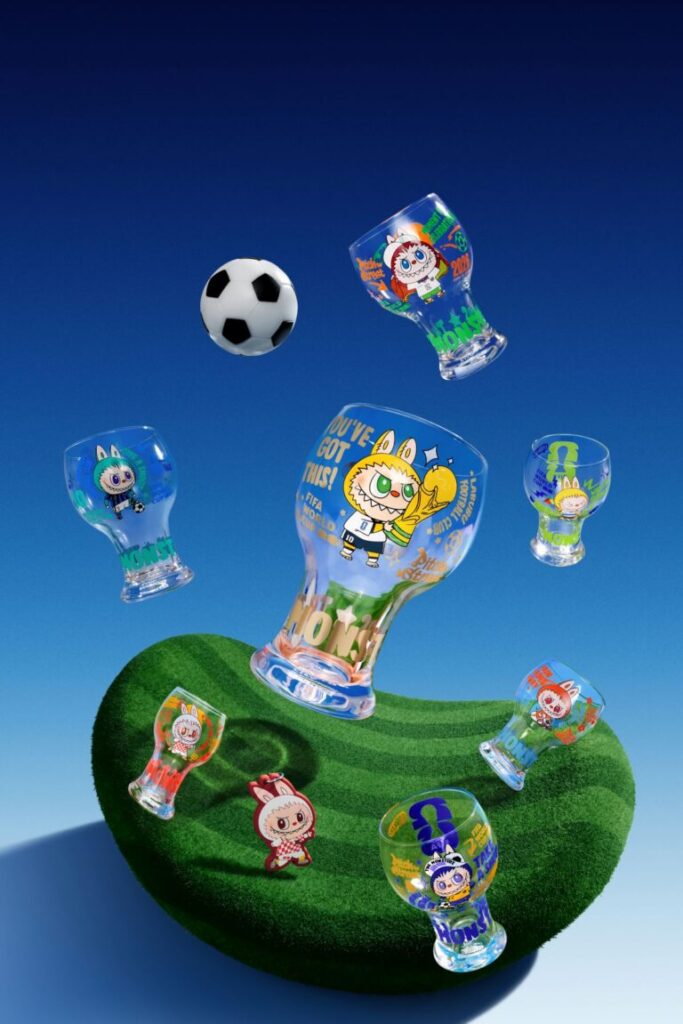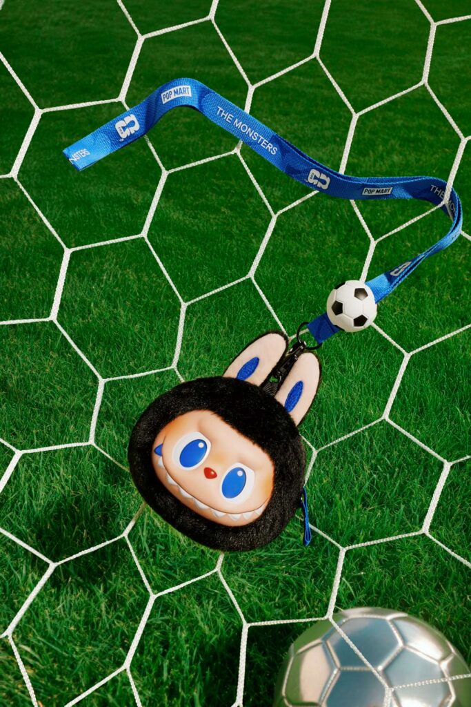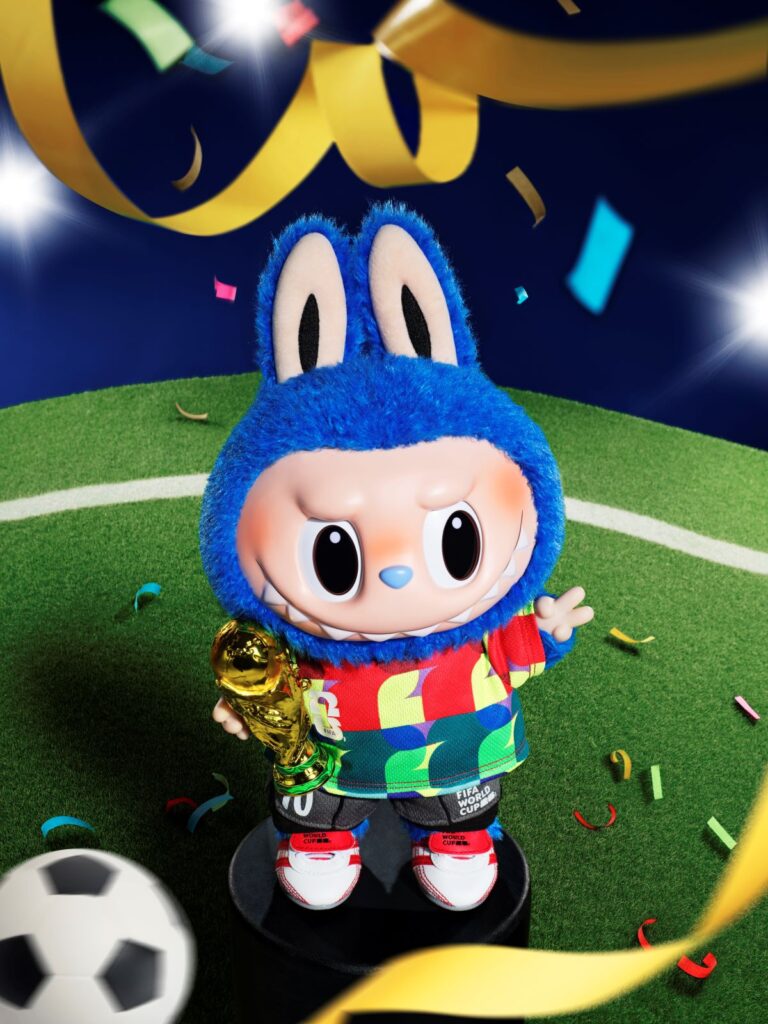 Центральное место в коллекции занимает виниловая плюшевая кукла The Monsters x FIFA, на которой изображен ярко-синий Лабубу футбольной форме и мини-бутсах, монстрик держит трофей чемпионата мира в руках.